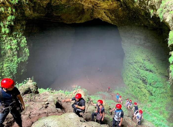 Petualangan dimulai dengan turun vertikal sejauh 60–80 meter menggunakan tali dan harness. Jangan khawatir kamu akan dipandu oleh guide bersertifikat dari komunitas lokal yang berpengalaman. Ini bukan untuk pemula, tapi rasa takutmu akan terbayar lunas begitu menginjak dasar gua.